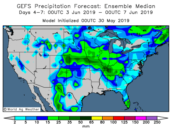 La superficie de maïs abandonnée – La date d’abandon du maïs était le 25 mai (samedi dernier) pour les Dakota, le Nebraska et le Kansas. La date d’abandon de maïs en Iowa et dans la majeure partie du Minnesota est le 31 mai (vendredi prochain) et celle de l’Illinois, de l’Indiana et l’Ohio est le 5 juin.
