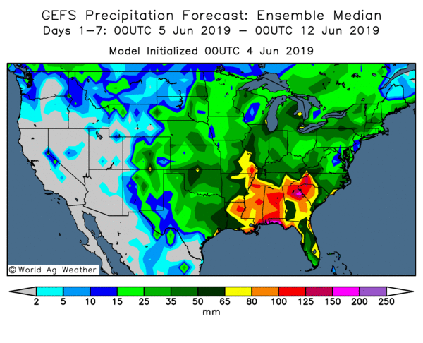 La récolte de maïs 2019 aux États-Unis est ensemencée à 67 %, contre 96 % l’an passé et 96 % pour la moyenne quinquennale. Cela représente une avance de 9 % pour la semaine. Si nous utilisons l’estimation de 92,8 millions d’acres prévue en mars, il reste encore plus de 30 millions d’acres de maïs à semer. Je ne pense pas que tous les acres prévus seront ensemencés.
