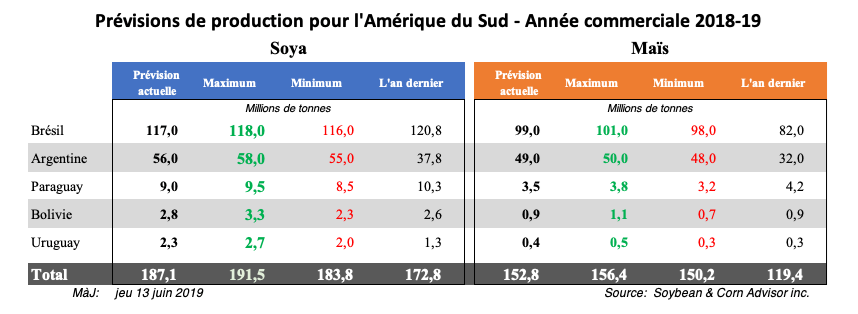 Dans son rapport sur les cultures du mois de juin, CONAB a augmenté ses estimations de la récolte de maïs brésilien 2018/2019 de 1,8 million de tonnes pour atteindre 98,0 millions de tonnes. L’estimation de soya brésilien 2018/2019 a été augmentée de 0,5 million de tonnes pour atteindre 114,8 millions de tonnes.