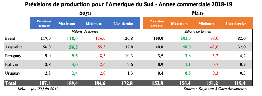 Les rendements du maïs safrinha au Paraná sont meilleurs que prévu en raison des pluies de fin de saison alors que la récolte était au remplissage des grains. Rabobank estime à 70,4 millions de tonnes la production de maïs safrinha 2019, soit à 5 % de plus que le record précédent. Selon leurs estimations, la récolte de totale de maïs au Brésil atteindrait 97,4 millions de tonnes, soit 20 % de plus que l’année dernière. Le USDA est encore optimiste, estimant la récolte de maïs brésilien à 101,0 millions de tonnes.