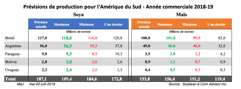 CONAB estime à 97,0 millions de tonnes la récolte brésilienne de maïs 2018/2019, dont 70,6 millions de tonnes de maïs safrinha (73 % de la production totale de maïs du Brésil) et 26,3 millions de tonnes de maïs de pleine saison (27 % de la production totale de maïs du Brésil). Selon certaines estimations privées, la production brésilienne de maïs 2018/2019 serait de 100 millions de tonnes, voire légèrement supérieure. Les exportations de maïs du Brésil proviennent principalement de la production safrinha et le pays est actuellement le deuxième exportateur de maïs en importance après les États-Unis.