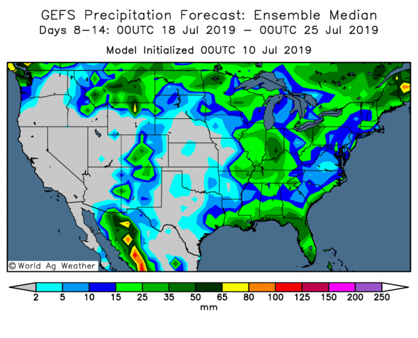 Impact de la sécheresse potentielle – Après un printemps et un début d’été très humide, nous devrons peut-être commencer à nous inquiéter du potentiel de conditions plus sèches. Une semaine de temps chaud et sec est bénéfique pour les cultures, deux semaines de climat chaud et sec seraient neutres et trois semaines de ce type de temps seraient néfastes pour les récoltes. Une grande partie du Corn Belt est maintenant dans la deuxième semaine de ce type de conditions et il reste à voir si la semaine prochaine sera également chaude et sèche.