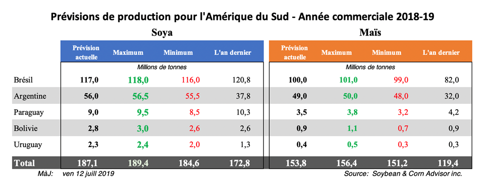 Dans son rapport sur les cultures de juillet, CONAB a augmenté son estimation du maïs brésilien 2018/20219 de 1,5 millions de tonnes, pour atteindre 98,5 millions de tonnes, et la hausse de l’estimation du soya brésilien 2018/2019 est de 0,2 million de tonnes, pour totaliser 115 millions de tonnes.