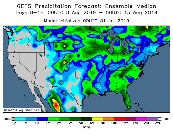 La récolte de maïs américain 2019 est à 58 % au stade de la soie, alors qu’elle l’était à 90 % l’an dernier. La moyenne quinquennale est de 83 %. Avec 58 % du maïs au stade de la soie, cela signifie qu’environ 40 % du maïs sera pollinisé au cours du mois d’août. Il n’y a pas de chaleur extrême prévue pour la première quinzaine d’août, mais il n’y a pas non plus beaucoup de précipitations dans les prévisions et c’est ce qui m’inquiète pour les 40 % du maïs qui polliniseront au cours des 3 prochaines semaines. Le maïs est à 13 % au stade pâteux, contre 35 % l’année dernière et 23 % pour la moyenne quinquennale.