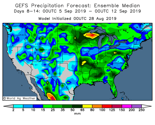 Une question concernant le soya est la suivante : dans quel délai le soya du Corn Belt commencera-t-il à jaunir ? Une fois que les feuilles commencent à jaunir, il n’y a plus de gain de rendement et les graines de soya commencent à perde de l’humidité. L’année dernière, au 27 août, 7 % du soya laissait tomber des feuilles, comparativement à 5 % en 2017 et à 4 % pour la moyenne quinquennale. Ainsi, certains plants de soya hâtif du Corn Belt pourraient commencer à se colorer cette semaine.