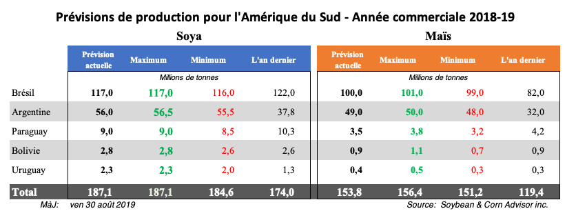 Au mois d’août, les bases au port de Paranagua ont augmenté de 55 %, passant de 0,90 $ US à 1,40 $ US le boisseau par rapport à ce qui est offert au Chicago Board of Trade. Pour septembre, elles ont augmenté de 42 %, allant de 0,95 $ US à 1,35 $ US le boisseau au-dessus de ce qu’offre Chicago.