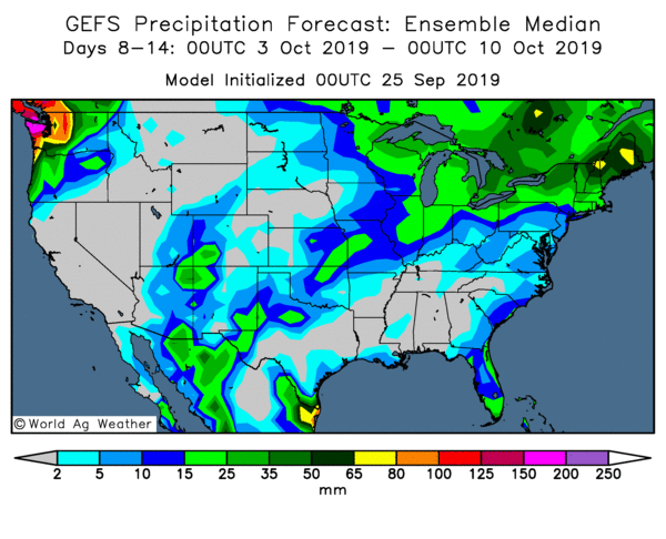 Du côté des points positifs, chaque semaine sans risque de gel est une autre semaine plus proche d’une fin réussie pour la récolte. Il pourrait y avoir un risque de gel dans les prévisions à long terme pour l’extrême nord-ouest du Corn Belt, mais il est trop tôt pour juger des dommages potentiels. Dans l’intervalle, le risque de perte pour les cultures diminue.