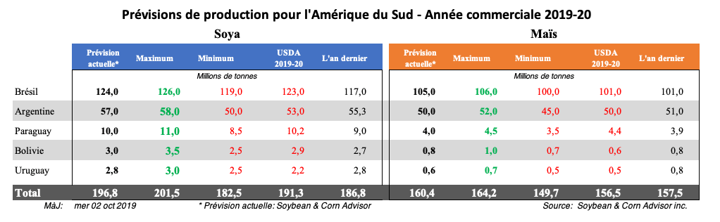 Soya argentin – De nombreuses incertitudes entourent les conditions météorologiques et les superficies cultivées en Argentine, ce qui entraîne un très large éventail d’estimations pour les cultures de soya et de maïs. Nous devrions avoir plus de clarté au cours des prochaines semaines au fur et è mesure que les agriculteurs procéderont à leurs ensemencements de printemps.