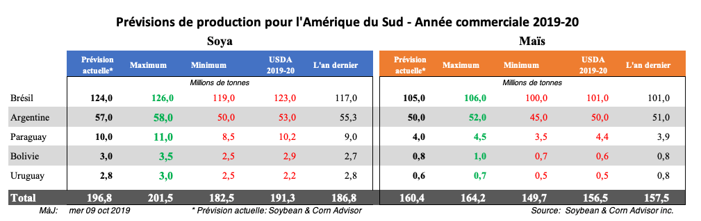 Le correspondant du USDA en Argentine estime que les agriculteurs argentins planteront 18,0 millions d’hectares de soya en 2019-2020 (44,4 millions d’acres), ce qui représente une augmentation de 0,2 million d’hectares par rapport à l’année dernière. Il estime que l'Argentine produira 53,0 millions de tonnes de soya en 2019/20, soit une baisse de 2,3 millions de tonnes par rapport à l'année dernière.
