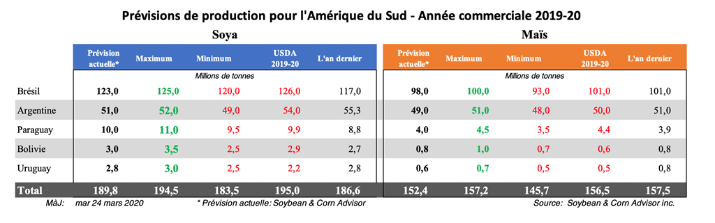 L'Association brésilienne des producteurs de soya et de maïs (Aorosoya) a abaissé son estimation du soya brésilien 2019/20 au début de la semaine dernière à 120,6 millions de tonnes. Ce chiffre est en baisse par rapport à ses estimations de 124,5 millions de tonnes de décembre, 124,0 millions en janvier et 123,0 millions en février. Elle a indiqué que la réduction était le résultat de la baisse des rendements au Rio Grande do Sul où elle s'attend à ce que la production de soya baisse à 12,8 millions de tonnes. À l'origine, l'État devait produire plus de 19 millions de tonnes de soya.