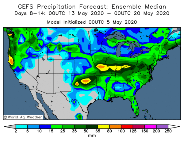 Le Corn Belt oriental a reçu le plus de pluie la semaine dernière avec des zones de l'Illinois qui ont reçu plus de 4-5 pouces. Il y a plus d’averses dans les prévisions pour cette semaine ainsi que des températures plus fraîches, donc il y aura des semis plus lents dans l'est du Corn Belt. Le maïs en Illinois est semé à 56% (54% en moyenne quinquennale), en Indiana, il l’est à 33% (à 26% en moyenne quinquennale) et en Ohio les travaux sont finalisés à 10% (en moyenne à 20% quinquennale).