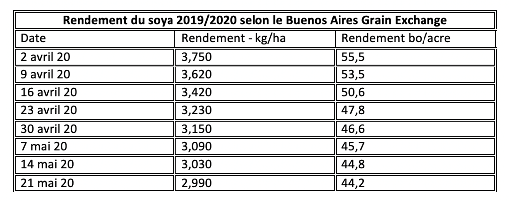 Soya d’Argentine - Les agriculteurs argentins ont récolté 93,3% de leur soya, contre 85,0% l'an dernier et 80,9% pour la moyenne des 5 dernières années. Il s'agit du rythme de récolte le plus rapide depuis 2012/13. Selon le Buenos Aires Grain Exchange (BAGE), le rendement courant du soya a encore baissé cette semaine pour s'établir à 2 990 kg / ha (44,2 boisseaux / acre), en baisse de 0,6 boisseau / acre par rapport à la semaine dernière. Le BAGE estime que le rendement final du soya sera de l'ordre de 2950 kg / ha (43,6 boisseaux / acre) et il a laissé son estimation de soya 2019/20 inchangée à 49,5 millions de tonnes.