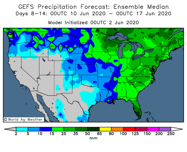 Les sols sont plus humides que la moyenne, mais pas aussi humides que l'année dernière lorsque nous avons eu d'importantes inondations dans l’ouest du Corn Belt. Les prévisions à plus long terme appellent des conditions plus chaudes et plus sèches, de sorte que l'humidité du sol devrait commencer à diminuer dans les semaines à venir. L'humidité du sol diminue généralement jusqu'à la deuxième ou la troisième semaine d'août où elle a une petite reprise avant le début de l'automne.