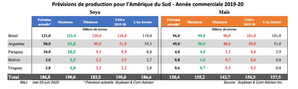 À ce stade, j'estime la superficie de soya 2020 aux États-Unis à 85,0 millions d'acres et je pense que les rendements de soya seront dans la ligne de tendance ou un peu plus élevés. Par conséquent, j'estimerais le rendement du soya aux États-Unis en 2020 dans une fourchette de 50,0 à 52,0 boisseaux / acre.