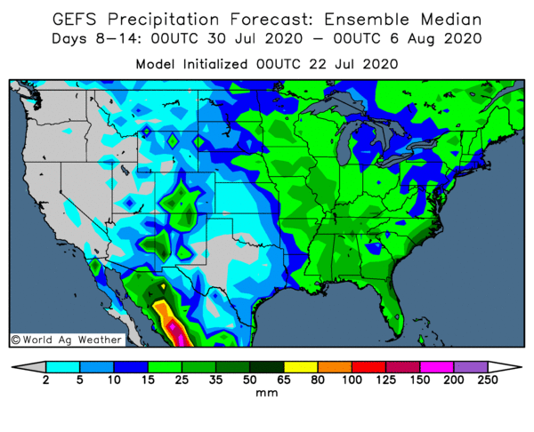 Les précipitations de la semaine dernière et celles du week-end ont été généralement bénéfiques dans une grande partie du Corn Belt. L'État qui en a probablement le plus profité est l'Illinois. Certains des États du nord qui ont reçu des averses comme le Minnesota, l'est de l'Iowa et le Wisconsin se portaient déjà assez bien. Le maïs est maintenant à 59% au stade de la soie.