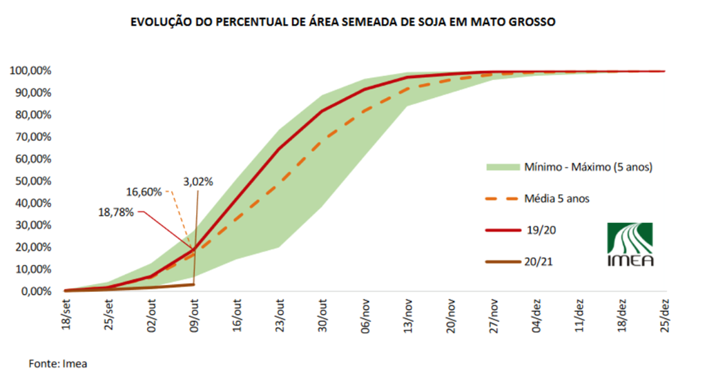 Ci-dessous se trouve un graphique de l’Imea intitulé «Évolution du pourcentage de soya planté dans le Mato Grosso» illustrant les progrès des semis de soya dans le Mato Grosso. La zone ombrée verte est le maximum et le minimum, la ligne en tiret est la moyenne sur cinq ans, la ligne rouge est 2019/20 et la ligne en brun est 2020/21. Comme vous pouvez le constater, les semis de soya démarrent très lentement dans le Mato Grosso.