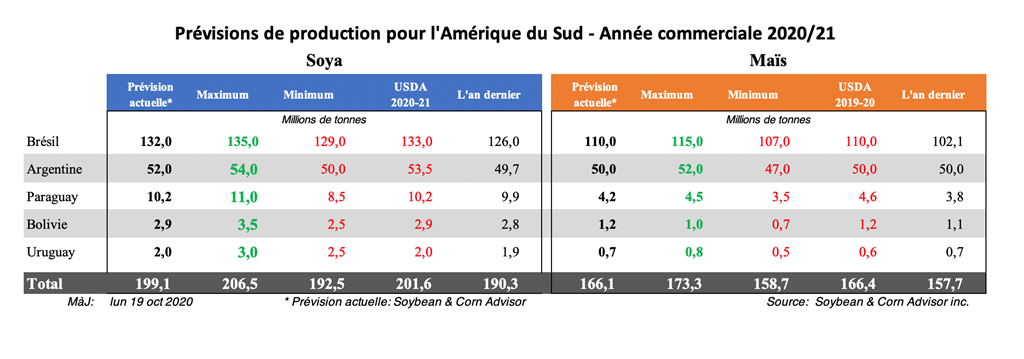 La récolte du maïs de saison complète commencera en janvier, mais cette récolte ne représente qu'environ un quart de la production totale de maïs du Brésil. Les trois quarts du maïs brésilien seront produits sous forme de safrinha qui sera récoltée en juin et juillet prochains. La nouvelle récolte de soya sera disponible à partir de février prochain. La quasi-totalité du soya et du maïs importés jusqu'à présent au Brésil proviennent du Paraguay voisin, mais leur approvisionnement est presque épuisé.