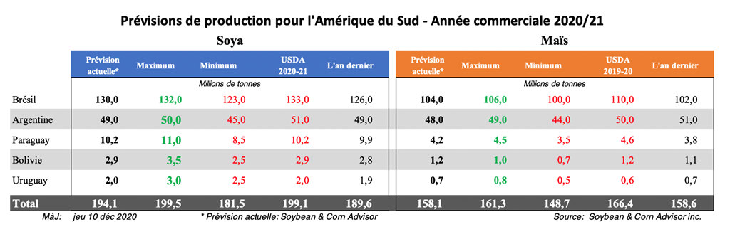 À titre d'exemple de la façon dont la récolte sera retardée cette saison de croissance, à la fin de janvier 2020, les agriculteurs de l'État du Mato Grosso avaient récolté environ 11 millions de tonnes de soya. On estime qu'à la fin de janvier 2021, les agriculteurs de l'État auront récolté environ 4 millions de tonnes de soya. En fait, il y a des rapports selon lesquels certains agriculteurs du Mato Grosso sont en train de renégocier leurs contrats avec les sociétés de grains parce qu'ils ne seront pas en mesure de livrer le soya à la date prédéterminée, comme le 15 janvier.