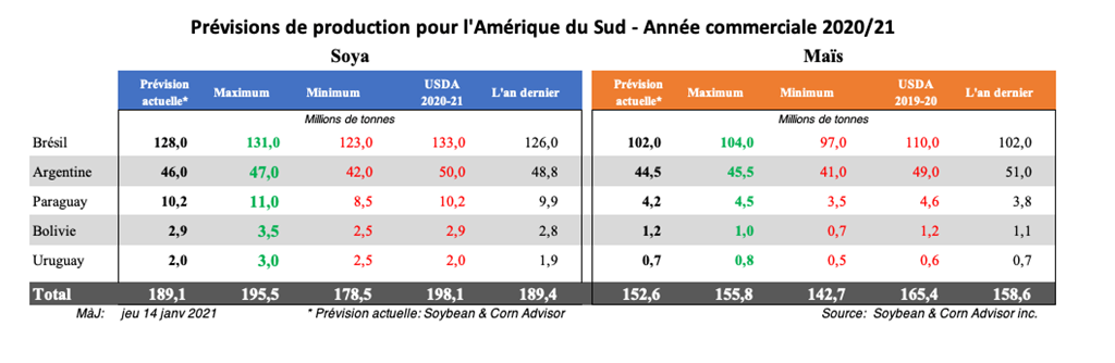 Dans les principales zones de production, le maïs semé hâtivement est au milieu de son stade de remplissage du grain et la région est considérée à 65% en sécheresse. Le Rosario Grain Exchange a rapporté que dans la ville de Pergamino, dans le nord de Buenos Aires, ils estiment des rendements de maïs au pire des cas dans une fourchette de 5000 à 6000 kg / ha (79,5 à 95,4 boisseaux / acre) avec un meilleur scénario de rendement de 8000 kg / ha (127 bo. / acre), mais le meilleur cas ne sera atteint que si elles reçoivent des précipitations importantes d'ici la fin de cette semaine. Ils ont indiqué que les 3-4 feuilles inférieures du maïs sont maintenant sèches car la plante prend les nutriments des feuilles inférieures pour aider à remplir le grain, ce qui est normal pour le maïs en période de sécheresse.