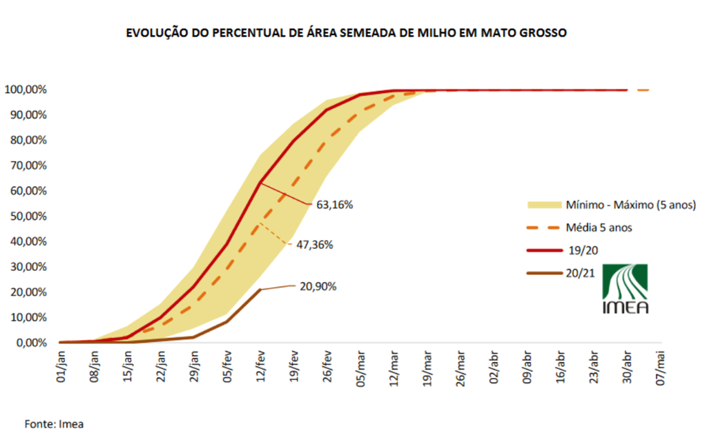 Ci-dessous, le graphique de l'Institut d'économie agricole du Mato Grosso (Imea) montrant le rythme de plantation du maïs safrinha dans le Mato Grosso? La ligne cramoisie est 2020/21, la ligne rouge est 2019/20, la ligne pointillée est la moyenne et la zone bronzée est le maximum et le minimum au cours des 5 dernières années.