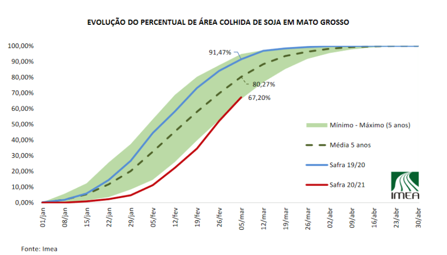 Vous trouverez ci-dessous le graphique de l'Institut d'économie agricole du Mato Grosso (Imea) montrant le rythme de récolte du soya dans le Mato Grosso. La ligne rouge est 2020/21, la ligne bleue est 2019/20, la ligne pointillée est moyenne et la zone verte est le maximum et le minimum au cours des 5 dernières années.