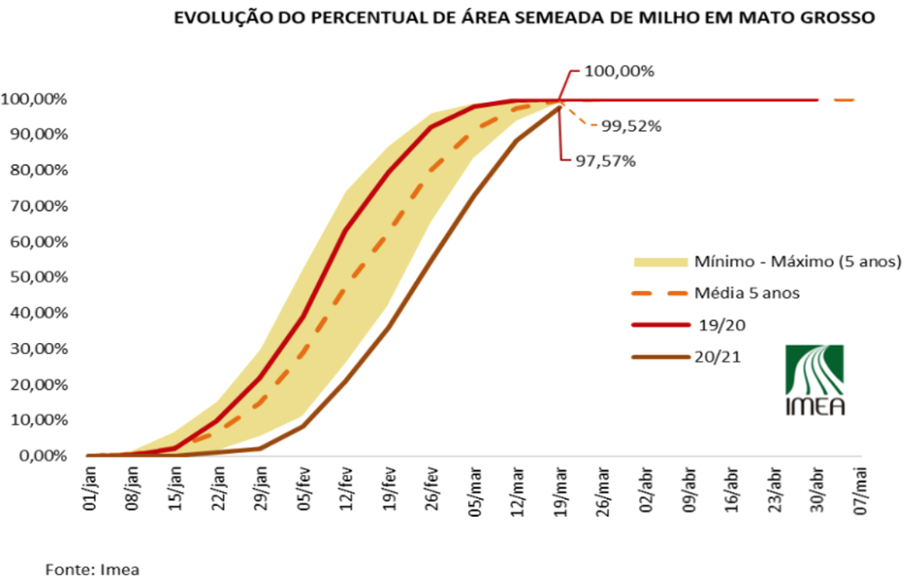 Comme vous pouvez le voir sur le graphique ci-dessous, l'Institut d'économie agricole du Mato Grosso (Imea) a indiqué que les semis sont essentiellement terminés, mais on ne sait jamais si tout le maïs prévu a été semé ou si elle a supposé que les agriculteurs ont déjà semé tous leur maïs qu'ils vont planter