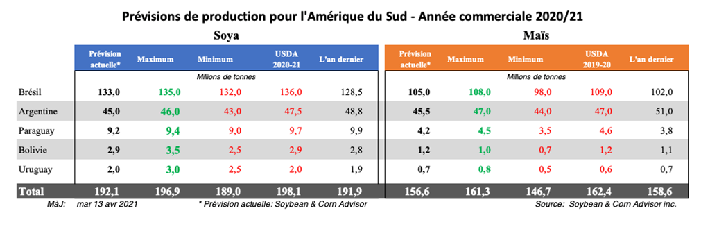 Dans son rapport d'avril sur les cultures, Conab a augmenté son estimation du maïs brésilien de 0,9 million de tonnes à 108,96 millions, mais des conditions plus sèches que la normale dans le centre-sud du Brésil pourraient compromettre cette estimation.