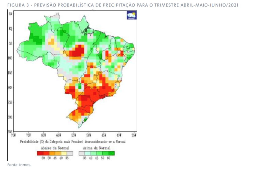 Le manque de précipitations ces dernières semaines dans le centre-sud du Brésil a réduit l'humidité du sol à moins de 40% de sa capacité. Le maïs du centre-sud du Brésil subit déjà un stress hydrique et malheureusement, les prévisions pour avril-mai-juin dans le centre-sud du Brésil sont inférieures à la normale avec des pluies irrégulières prévues pour le centre du Brésil. Vous trouverez ci-dessous les prévisions de précipitations pour avril-mai-juin du service météorologique national brésilien. Comme vous pouvez le voir, ce n'est pas une bonne prévision pour le maïs safrinha dans le centre-sud du Brésil.