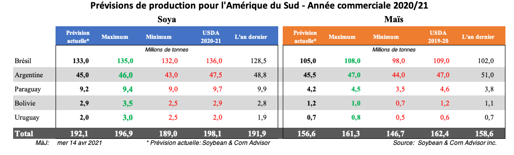 Dans son rapport WASDE d'avril, l'USDA a laissé son estimation de la production de soya argentin 2020/21 inchangée à 47,5 millions de tonnes. La Bourse des grains de Buenos Aires a abaissé son estimation de la production de soya argentin 2020/21 de 1,0 million de tonnes à 43,0 millions.