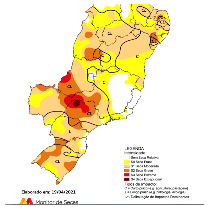 La carte ci-dessous est la dernière évaluation de la situation de sécheresse dans le centre-sud du Brésil. Elle est fournie par l'Agence nationale brésilienne de l'eau (Ana). Telle était la situation à la fin du mois de mars et elle s'est asséchée depuis. L'État de Sao Paulo est actuellement l'État le plus déficient en humidité du sol (indiqué par la zone rouge foncé sur la carte).