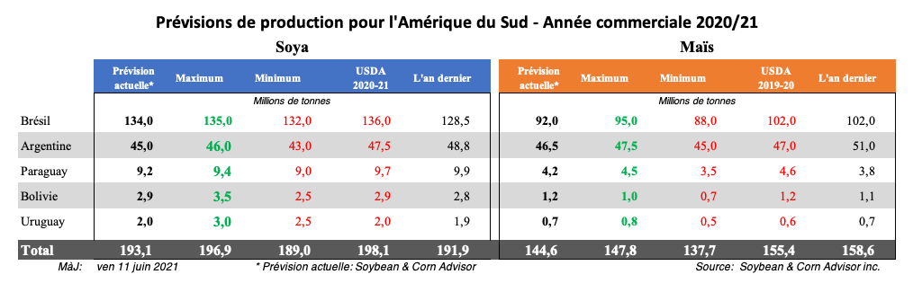 Les exportations de maïs du Brésil 2020/21 ont été révisées à la baisse à 29,5 millions de tonnes contre 35 millions de tonnes en mai. Le report de maïs du Brésil pour 2020/21 a été réduit de 27 % à 7,6 millions de tonnes contre 10,9 millions de tonnes en mai. Si vérifié, cela équivaudrait à un peu plus d'un mois de consommation domestique.