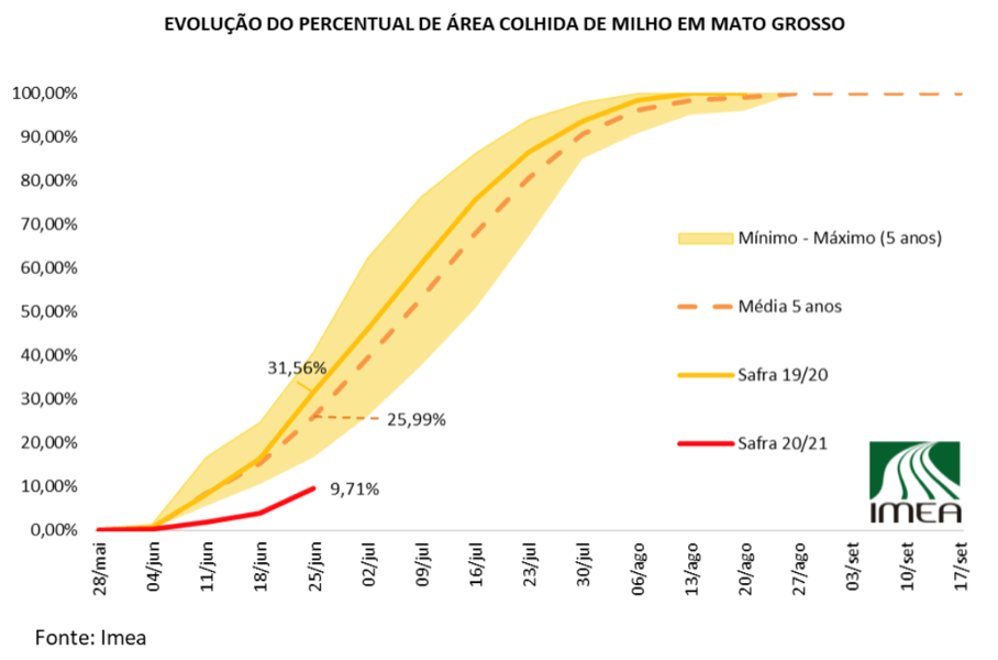 Le graphique ci-dessous illustre les progrès de la récolte de safrinha dans le Mato Grosso. La ligne rouge foncé représente les progrès de la récolte de cette année, la ligne jaune représentant les progrès de l'année dernière et la ligne pointillée représentant la moyenne sur 5 ans. La zone ombrée en jaune est la progression maximale et minimale de la récolte au cours des 5 dernières années.