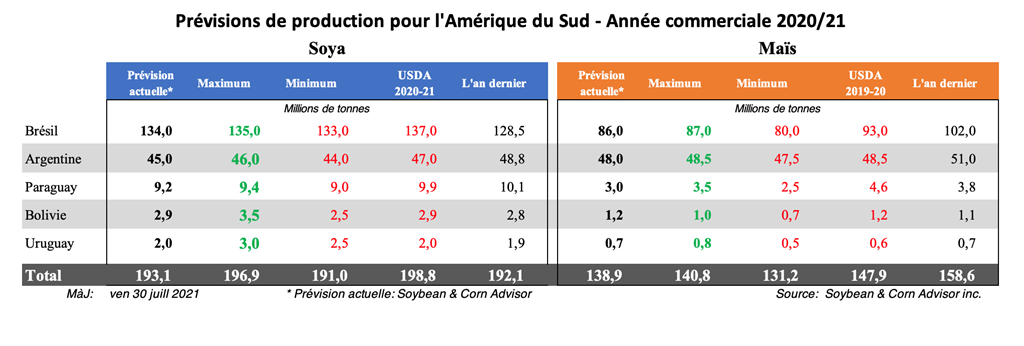 Maïs safrinha - Le maïs safrinha avait déjà été gravement touché par des semis tardifs et une sécheresse historique pendant la majeure partie de son développement. Des dommages supplémentaires ont résulté de deux vagues de températures glaciales à la fin juin et en juillet. Les températures les plus froides de la saison sont prévues pour le jeudi 29 juillet et le vendredi 30 juillet. Les dégâts les plus graves sont attendus pour le maïs safrinha semé tardivement dans les États du Paraná, du Mato Grosso do Sul et de Sao Paulo. Le développement du maïs a été écourté pendant la pollinisation et le remplissage des grains et les agriculteurs signalent que le maïs ne sèche pas suffisamment pour la récolte. En plus des rendements inférieurs, la qualité du grain devrait être très mauvaise.