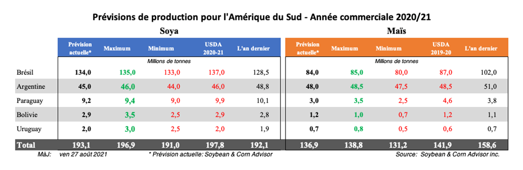 Dans son rapport sur les récoltes d'août, Conab a estimé la production de maïs brésilien à 86,6 millions de tonnes avec des importations de 2,3 millions de tonnes et des exportations de 23,5 millions de tonnes. On s'attend à ce que Conab réduise son estimation de maïs 2020/21 dans le rapport de récolte de septembre. Si cela se produit, elle augmentera probablement son estimation des importations de maïs et réduira son estimation des exportations de maïs.