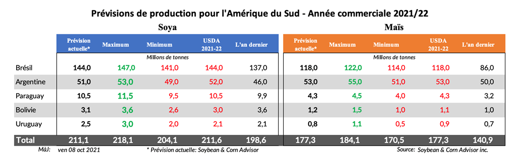 Dans sa première évaluation de la saison de croissance brésilienne 2021/22 publiée le jeudi 7 octobre, Conab a estimé la production brésilienne de soya 2021/22 à 140,75 millions de tonnes, soit 2,5% de plus que l'année dernière. Pour le maïs, Conab a estimé la récolte 2021/22 à 116,31 millions de tonnes, soit une augmentation de 33,7% par rapport à l'année dernière.