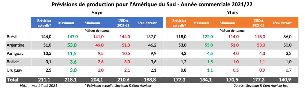 Dans le rapport sur les récoltes d'octobre 2021, Conab a estimé la première production de maïs à 28,3 millions de tonnes, la récolte de maïs safrinha à 86,3 millions de tonnes et la troisième récolte de maïs à 1,6 million de tonnes. Elle a estimé la production totale de maïs du Brésil 2021/22 à 116,3 millions de tonnes, soit 29,3 millions de plus que la production de l'an dernier de 86,9 millions de tonnes (+33,7%).