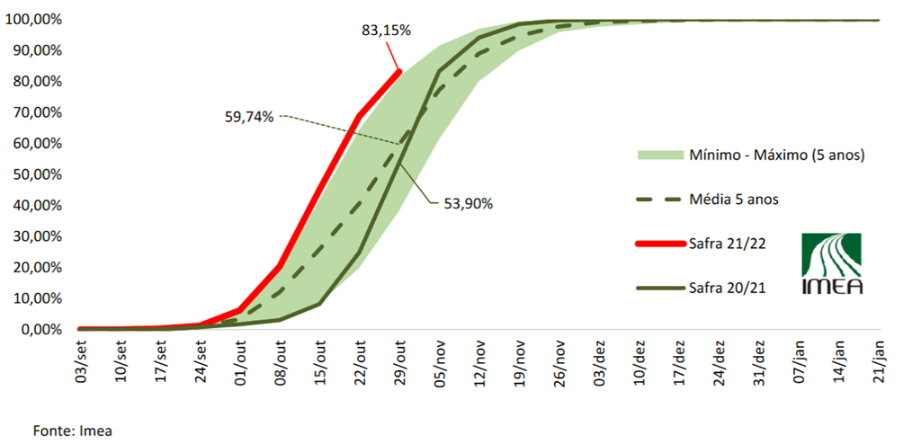 Ci-dessous, l'avancement des semis de soya dans le Mato Grosso estimé par l'Imea. La ligne rouge représente les progrès de cette année, la ligne sombre les progrès de l'année dernière et la ligne pointillée est la moyenne sur cinq ans. L'espace vert est le maximum et le minimum des cinq dernières années.