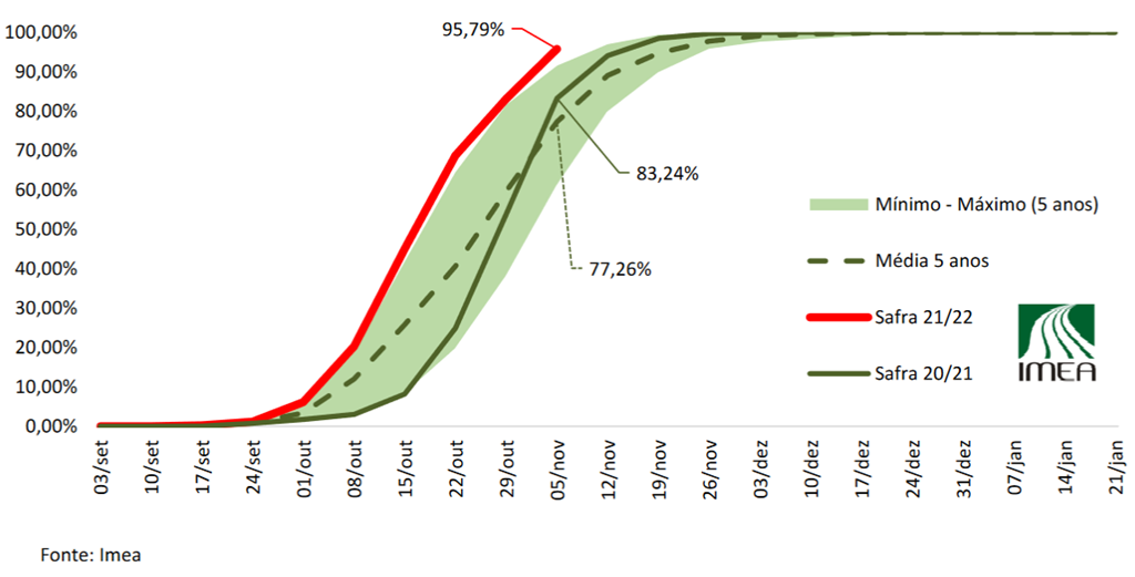 Vous trouverez ci-dessous les progrès de la plantation de soya dans le Mato Grosso noté par l'Institut d'économie agricole du Mato Grosso (Imea). La ligne rouge représente les progrès de cette année, la ligne sombre les progrès de l'année dernière et la ligne pointillée est la moyenne sur cinq ans. L'espace vert est le maximum et le minimum des cinq dernières années.