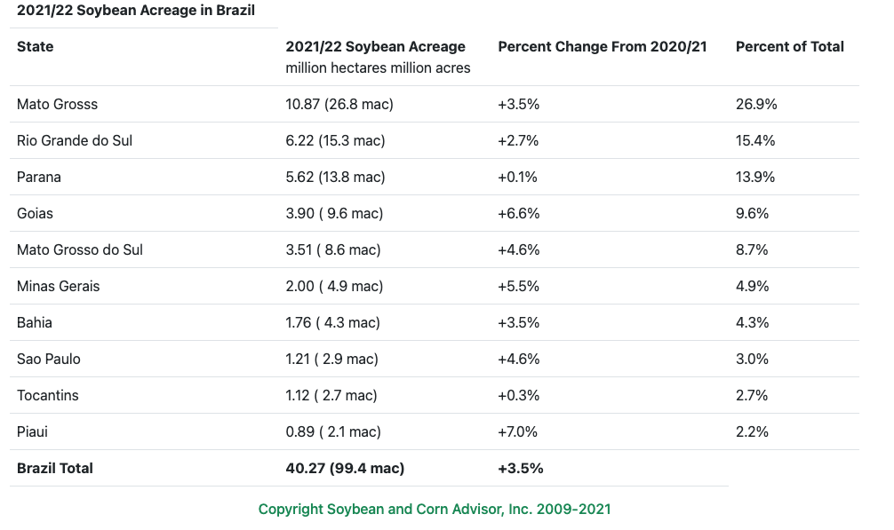L'État brésilien le plus au sud du Rio Grande do Sul détient environ 15 % de la superficie de soya du Brésil pour 2021/22, ce qui est le deuxième État après le Mato Grosso et légèrement devant celui du Paraná (voir le tableau ci-dessous). L'État du Paraná peut se retrouver avec une production de soya plus élevée parce que les rendements au Paraná sont généralement plus élevés qu'au Rio Grande do Sul.