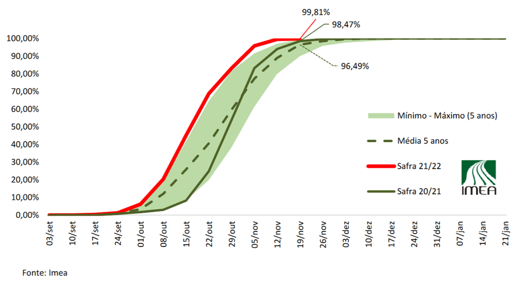 Vous trouverez ci-dessous le rythme de plantation du soya 2021/22 dans le Mato Grosso de l'Institut d'économie agricole du Mato Grosso (Imea).