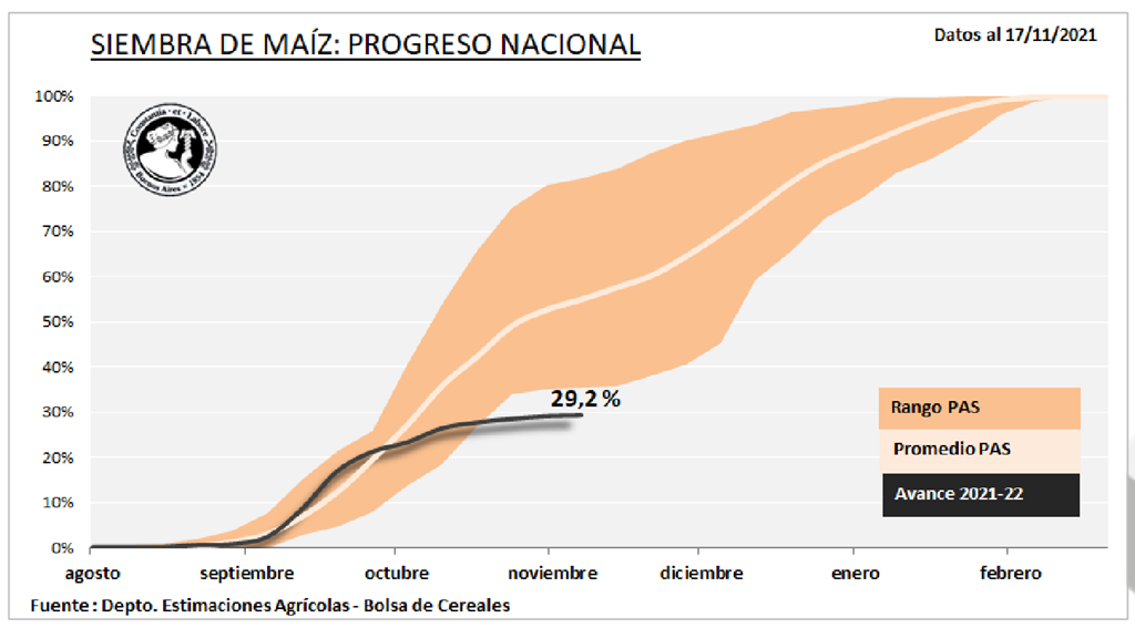 Selon la Bourse des grains de Buenos Aires, à la fin de la semaine dernière, le maïs était planté à 29,2 % contre 31,4 % l'an dernier et 38,2 % pour la moyenne des 5 dernières années. Cela représente une progression de seulement 0,2% pour la semaine. Dans la zone de production principale, le maïs est planté à 85-90% avec 30-40% du maïs planté dans le sud de l'Argentine et 0% semé dans l'extrême nord de l'Argentine.