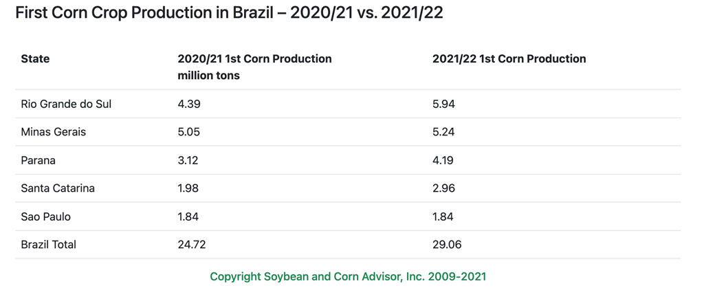 Vous trouverez ci-dessous un tableau des premières estimations de production de maïs pour 2020/21 et 2021/22. Les données de production proviennent du rapport de récolte de décembre de la Conab.