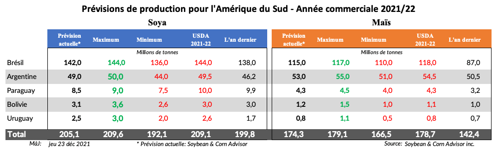 L'estimation du soya brésilien a été abaissée en raison de l'augmentation de la sécheresse dans le sud du Brésil. Dans l'État du Paraná, par exemple, le soya est dans la phase critique de remplissage des gousses et il y a des rapports selon lesquels des fleurs et des gousses ont avortées. Si les prévisions de temps chaud et sec dans le sud du Brésil se vérifient, il pourrait y avoir des réductions supplémentaires dans l'estimation du soya brésilien.