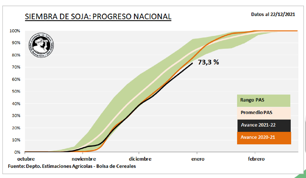 Le soya de pleine saison est planté à 82,9% et le soya à double récolte est semé à 55,4%. Environ 22 % des cultures de soya de pleine saison fleurissent. Les semis du soya de pleine saison dans le centre et le sud de l'Argentine devraient être achevés cette semaine.