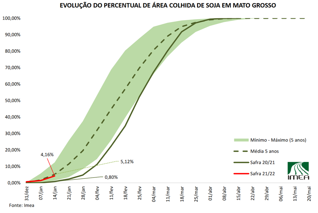 Le graphique ci-dessous fournit par l'Institut d'économie agricole du Mato Grosso (Imea) illustre la progression actuelle de la récolte (ligne rouge).