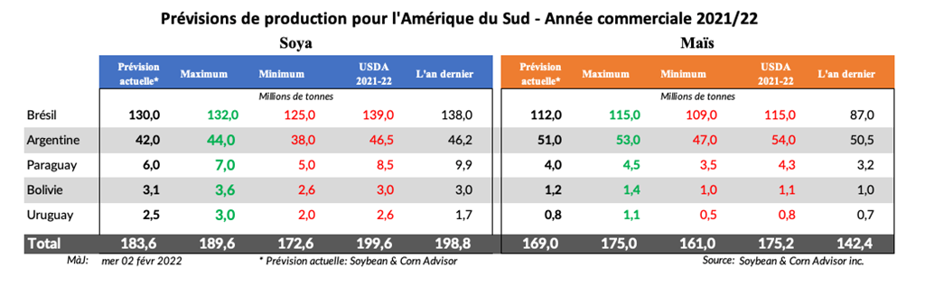 Des populations de plantes moins qu'optimales sont signalées dans certaines régions en raison des conditions extrêmes antérieures et les semis de soya ont été terminés plus tard que la normale. Ces cultures de soya plantées plus tardivement auront besoin d'un temps clément jusqu'en avril pour que la récolte atteigne son potentiel de rendement, ce qui n'est en aucun cas garanti.
