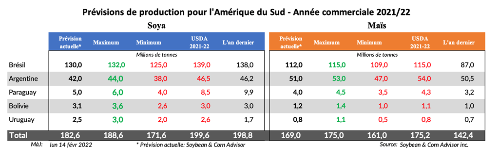 Dans le rapport sur les cultures de février publié le 10 février 2022, Conab a réduit son évaluation de la production brésilienne de soya 2021/22 de 15 millions de tonnes à 125,47 millions. La production brésilienne de maïs 2021/22 a été réduite de 0,56 million de tonnes à 112,34 millions.