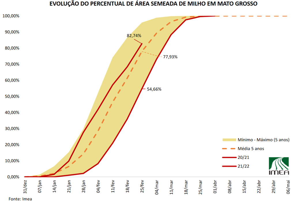 Comme vous pouvez le voir sur le graphique ci-dessous fourni par Imea, la plantation de maïs safrinha dans le Mato Grosso a 5 points d'avance sur la moyenne ou environ 2-3 jours d'avance sur la moyenne des 5 dernières années. Ce n'est pas aussi rapide qu'Imea l'avait prédit en décembre, lorsqu'elle estimait que 93 % du maïs safrinha serait planté au moment où la période de plantation idéale se finissait vers la troisième semaine de février. L'humidité excessive en janvier et février a ralenti la récolte de soya et donc la plantation de maïs safrinha.