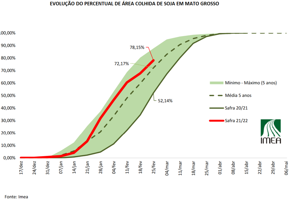 Mato Grosso - Selon l'Institut d'économie agricole du Mato Grosso (Imea), les agriculteurs du Mato Grosso avaient récolté 78 % de leur soya à la fin de la semaine dernière, contre 52 % l'an dernier et 72 % pour la moyenne des 5 dernières années. Cela représente une avance de 10,4 % pour la semaine. La récolte la plus avancée se situe dans la région du centre-nord avec 87,8 % du soya récolté. La récolte la plus lente se trouve dans le centre-sud avec 59% du soya récolté.