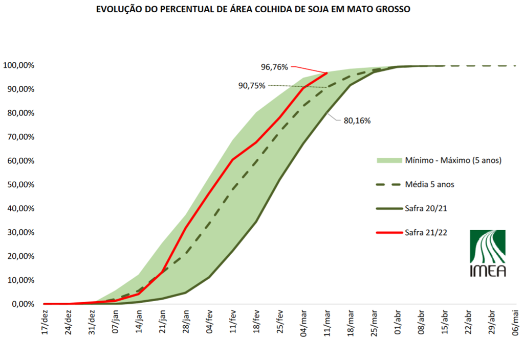 Mato Grosso - Selon l'Institut d'économie agricole du Mato Grosso (Imea). Les agriculteurs du Mato Grosso avaient récolté 96,7 % de leurs cultures de soya 2021/22 à la fin de la semaine dernière, contre 80,1 % l'année dernière et 90,7 % pour la moyenne des 5 dernières années. Cela représente une avance de 6,3% sur la semaine.